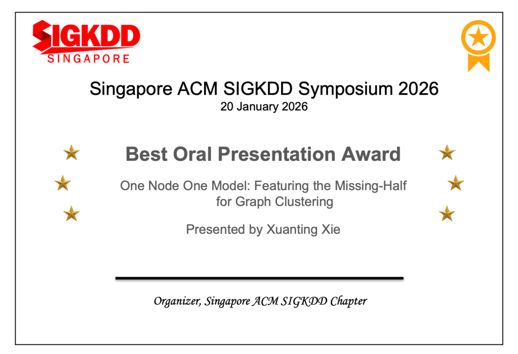 - One Node One Model: Featuring the Missing-Half for Graph Clustering — AAAI; Xuanting Xie, Bingheng Li, Erlin Pan, Zhaochen Guo, Zhao Kang, Wenyu Chen; University of Electronic Science and Technology of China & Singapore Management University