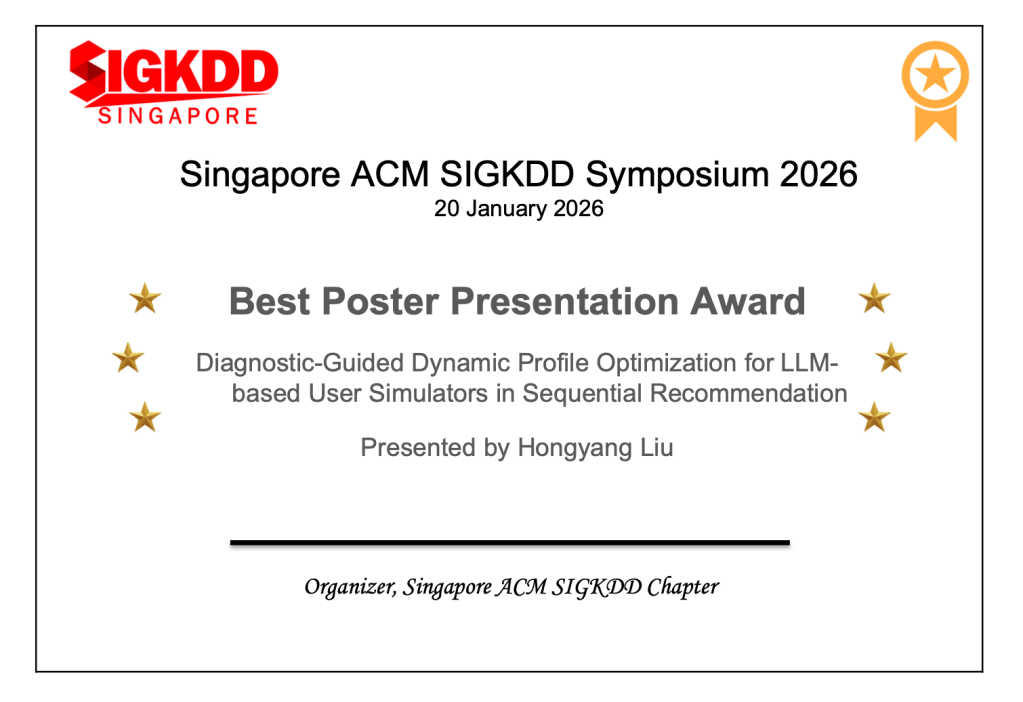 - Diagnostic-Guided Dynamic Profile Optimization for LLM-based User Simulators in Sequential Recommendation — AAAI; Hongyang Liu, Zhu Sun, Tianjun Wei, Yan Wang, Jiajie Zhu, Xinghua Qu; Macquarie University